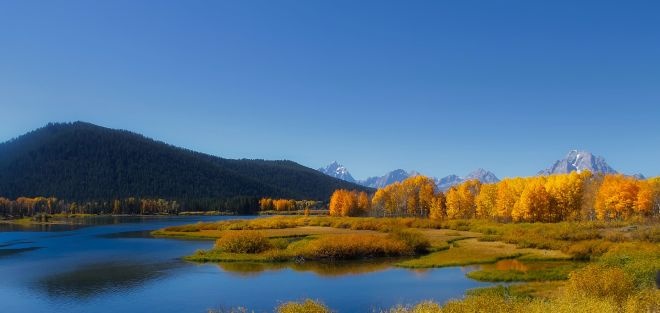 Traversée du parc national du Grand Teton. Ce parc est célèbre pour ses paysages montagneux dominés par le Grand Teton, nommé ainsi par les explorateurs canadiens français, qui culmine à 4197 m d’altitude. Ses roches, âgées de plus de deux milliards d’années, sont parmi les plus anciennes de la planète. Déjeuner.